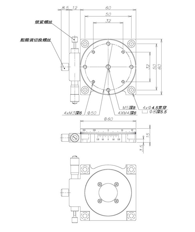 行 程:360°(粗调), ±5°(精调)